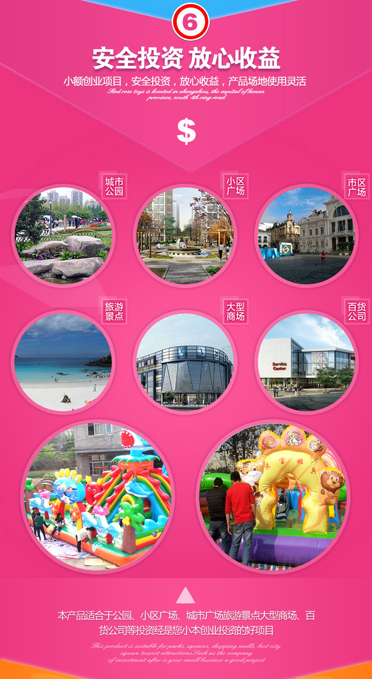 主营:淘气堡,室内儿童乐园,蹦蹦云,三维针雕,喊泉,充气水池,支架游泳池,充气城堡,充气蹦床,彩虹滑道,蹦床公园等游乐设备。