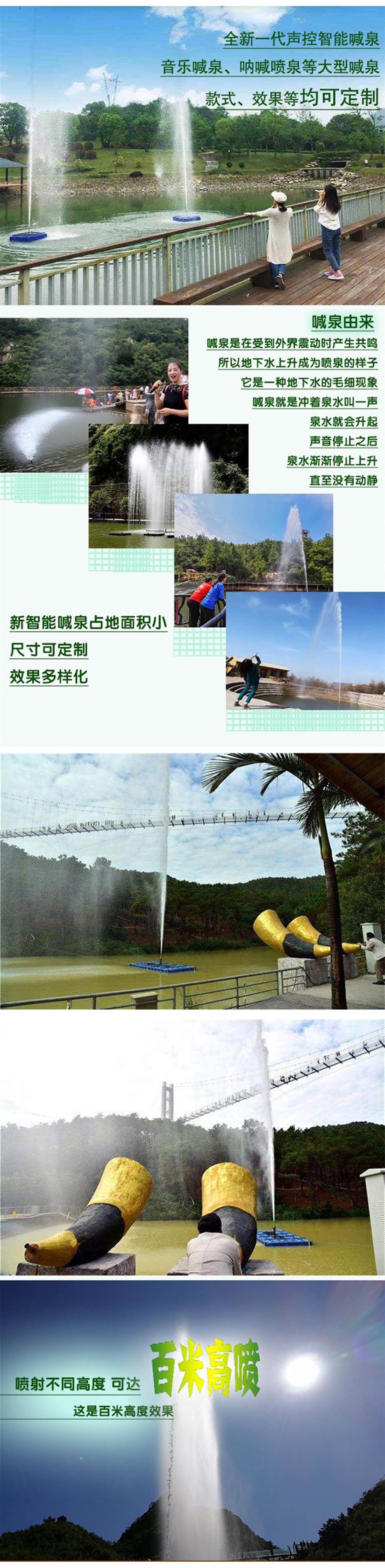 喊泉又被大家称作呐喊泉、声控喷泉等,可以根据场地设计成10米到100米不等,可加灯光等效果,在有水的景点都可能会有其设备,途经喊泉的游客,在看到别人“啊···”的时候,泉水随之喷涌而出,形成巨大的水柱,冲天而上,不禁心中激动万分,想要试上一试,解压又好玩的喊泉设备。
